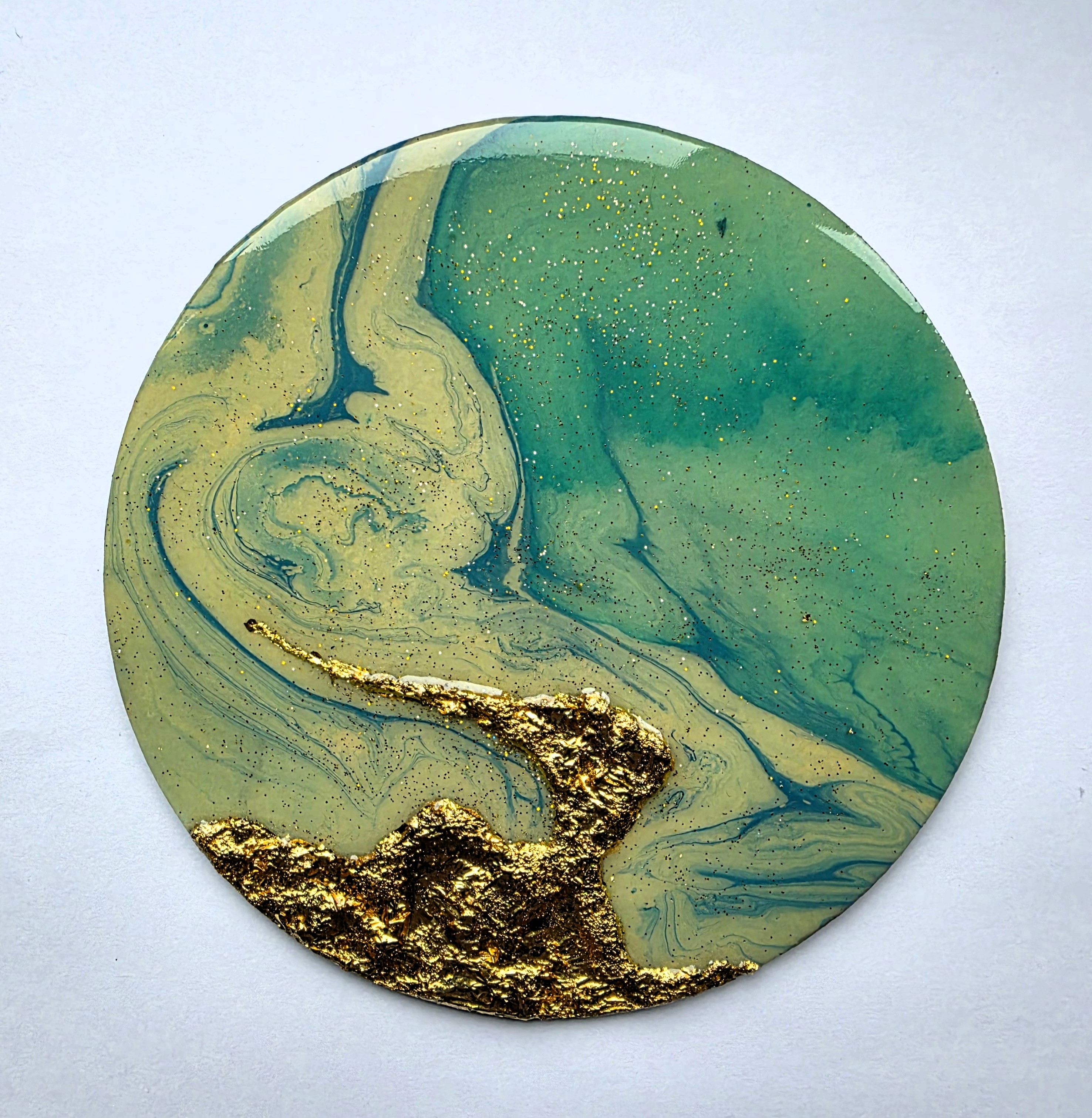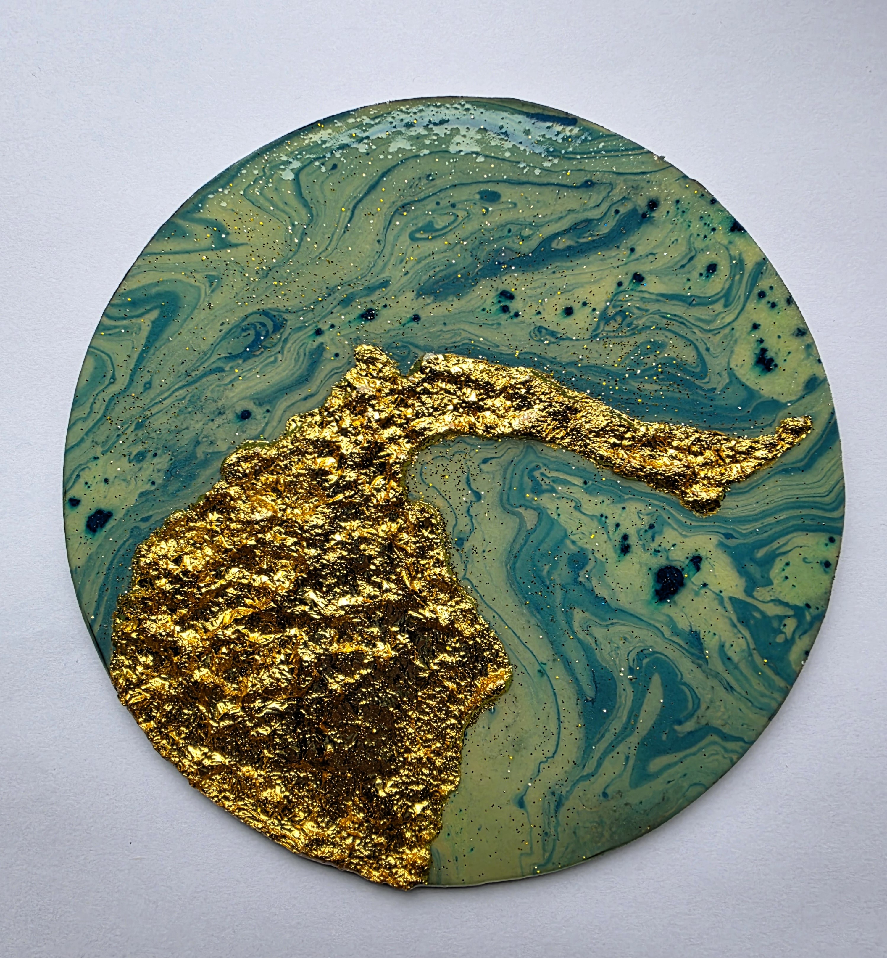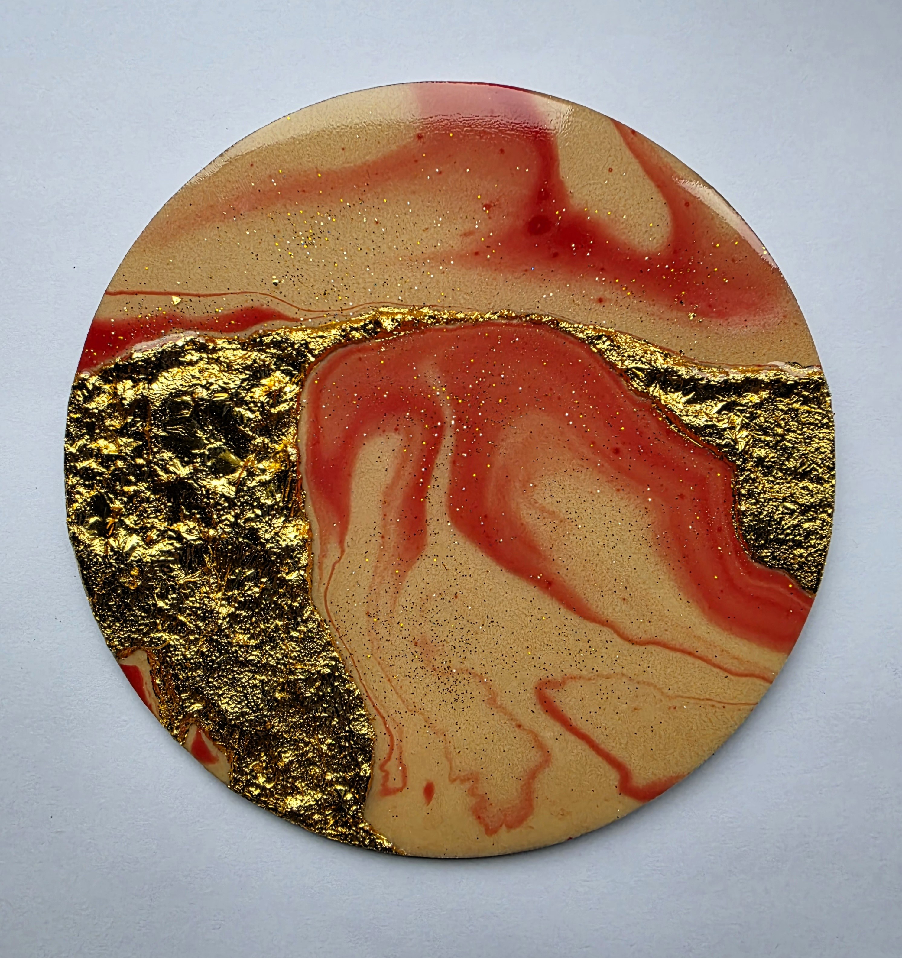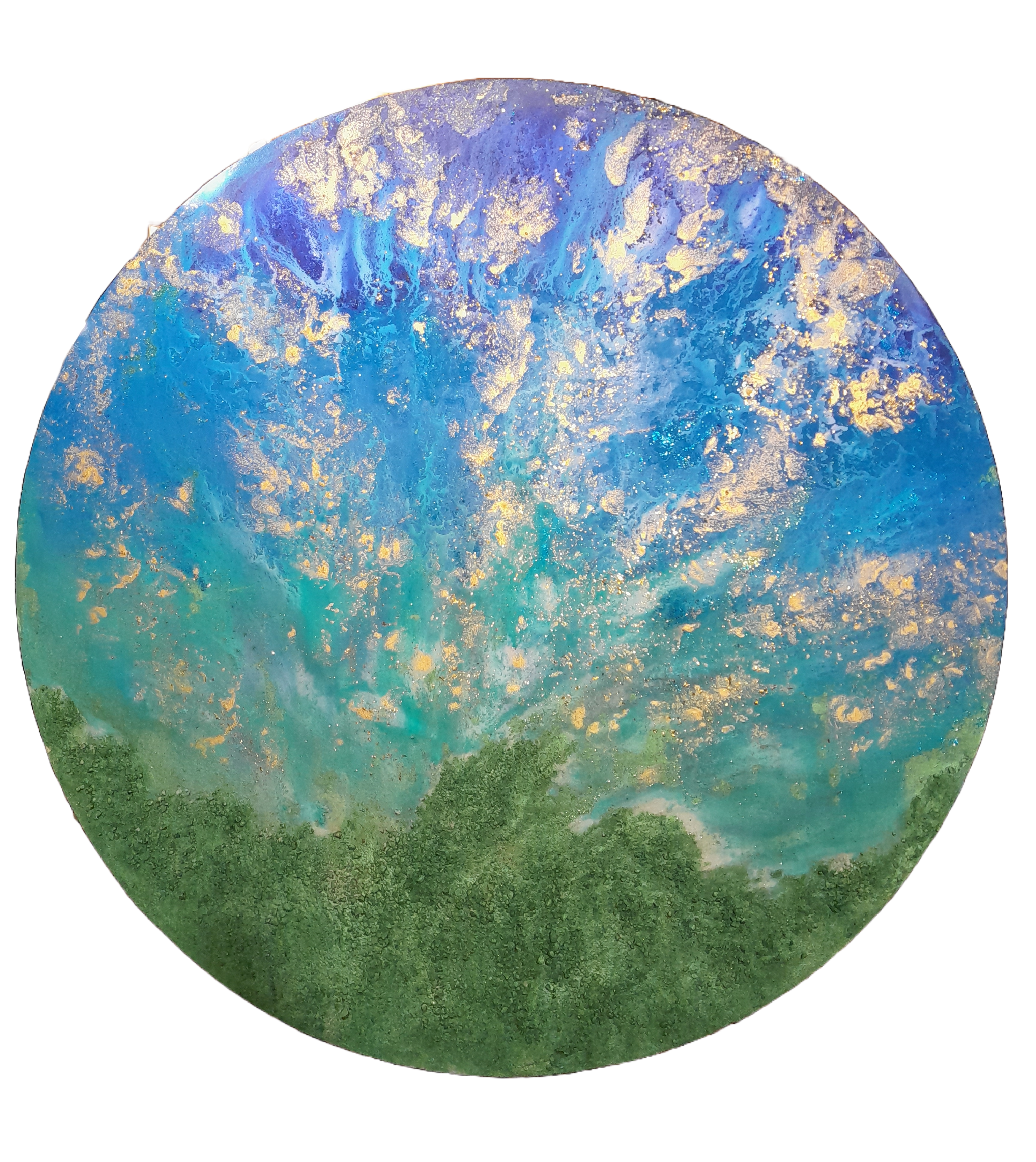 Dans la série ORIGINES, les œuvres suggèrent à la fois la Terre, un œil, une rétine, un atome ou un soleil : le cercle, figure primordiale et universelle, renvoie aux structures fractales à l’origine de la vie, des galaxies et des cellules, symbolisant le lien profond entre matière et existence.